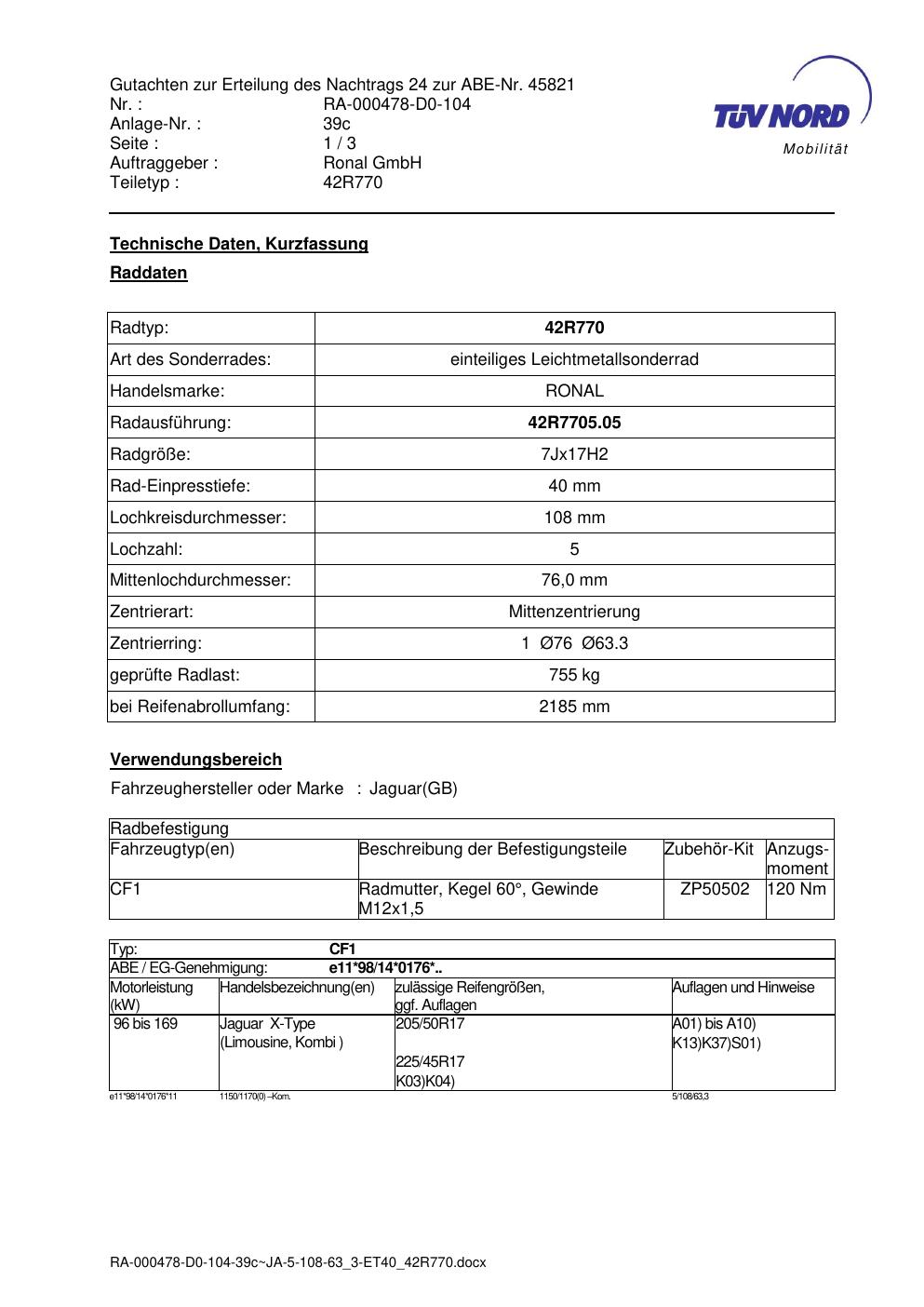 Dieses Gutachten (abe) bezieht sich auf die Alufelge Ronal 42R770 in der Ausführung 7Jx17 ET 0, Mittenloch 0 mm (KBA 45821). Im PDF findest du typischerweise zulässige Reifengrößen, Auflagen/Anbauhinweise und – je nach Dokument – Hinweise zur Eintragung.