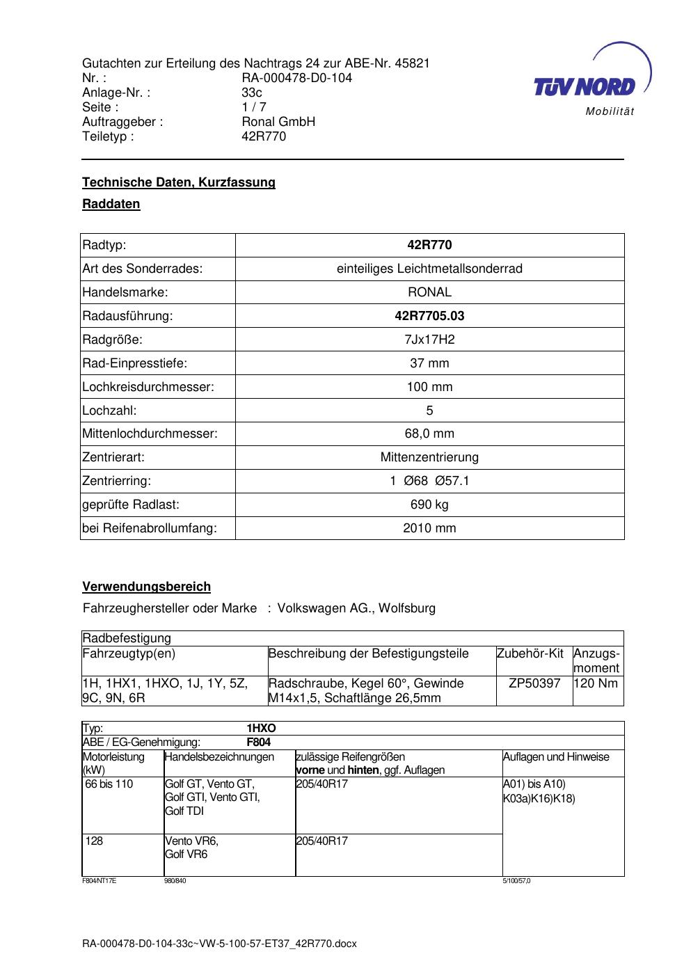 Dieses abe der Marke Ronal stammt vom jeweiligen Hersteller, Importeur oder einer Prüforganisation. Felgengutachten.de beansprucht hieran keine eigenen Urheber-, Nutzungs- oder sonstigen Schutzrechte. Soweit das Dokument urheber- oder leistungsschutzrechtlich geschützt ist, verbleiben die Rechte beim jeweiligen Rechteinhaber. Die Bereitstellung erfolgt ausschließlich zu Informationszwecken für Endnutzer, z. B. zur Vorlage bei Prüfstellen oder zur eigenen Fahrzeugdokumentation.