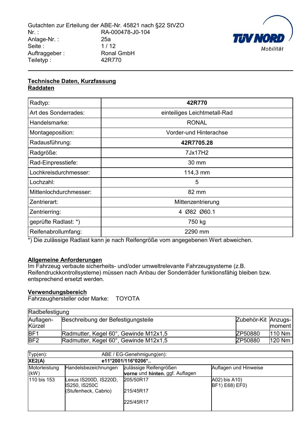 Dieses abe der Marke Ronal stammt vom jeweiligen Hersteller, Importeur oder einer Prüforganisation. Felgengutachten.de beansprucht hieran keine eigenen Urheber-, Nutzungs- oder sonstigen Schutzrechte. Soweit das Dokument urheber- oder leistungsschutzrechtlich geschützt ist, verbleiben die Rechte beim jeweiligen Rechteinhaber. Die Bereitstellung erfolgt ausschließlich zu Informationszwecken für Endnutzer, z. B. zur Vorlage bei Prüfstellen oder zur eigenen Fahrzeugdokumentation.