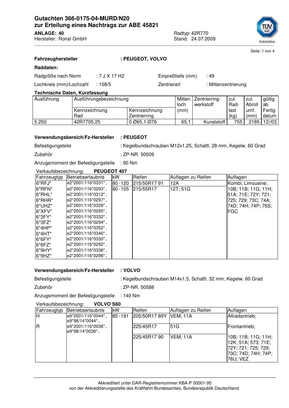 Dieses Gutachten (abe) bezieht sich auf die Alufelge Ronal 42R770 in der Ausführung 7Jx17 ET 0, Mittenloch 0 mm (KBA 45821). Im PDF findest du typischerweise zulässige Reifengrößen, Auflagen/Anbauhinweise und – je nach Dokument – Hinweise zur Eintragung.