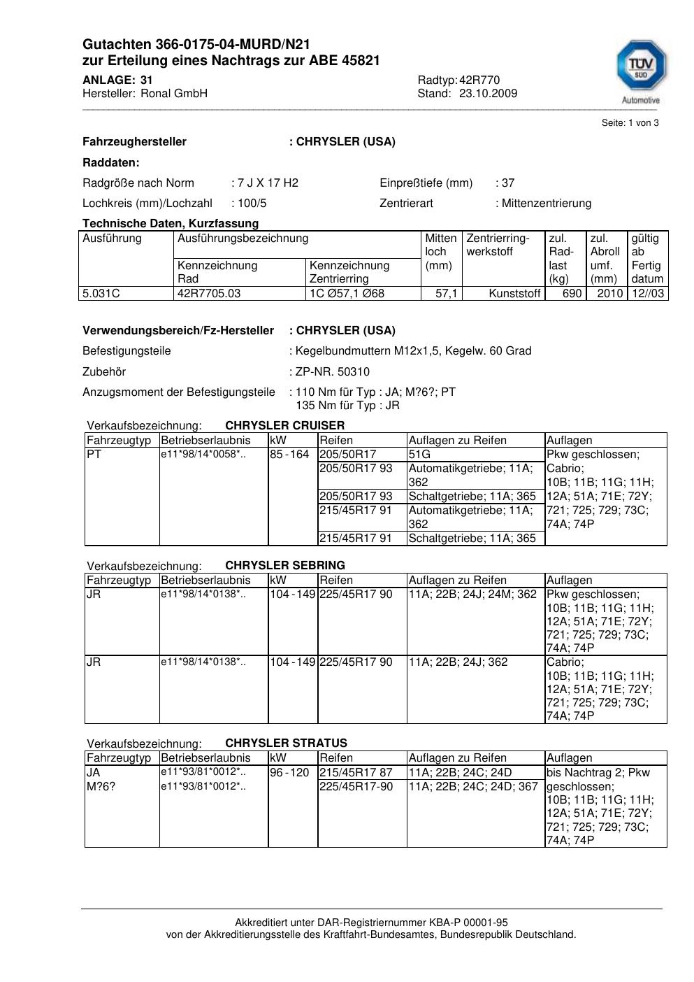 Dieses Gutachten (abe) bezieht sich auf die Alufelge Ronal 42R770 in der Ausführung 7Jx17 ET 0, Mittenloch 0 mm (KBA 45821). Im PDF findest du typischerweise zulässige Reifengrößen, Auflagen/Anbauhinweise und – je nach Dokument – Hinweise zur Eintragung.