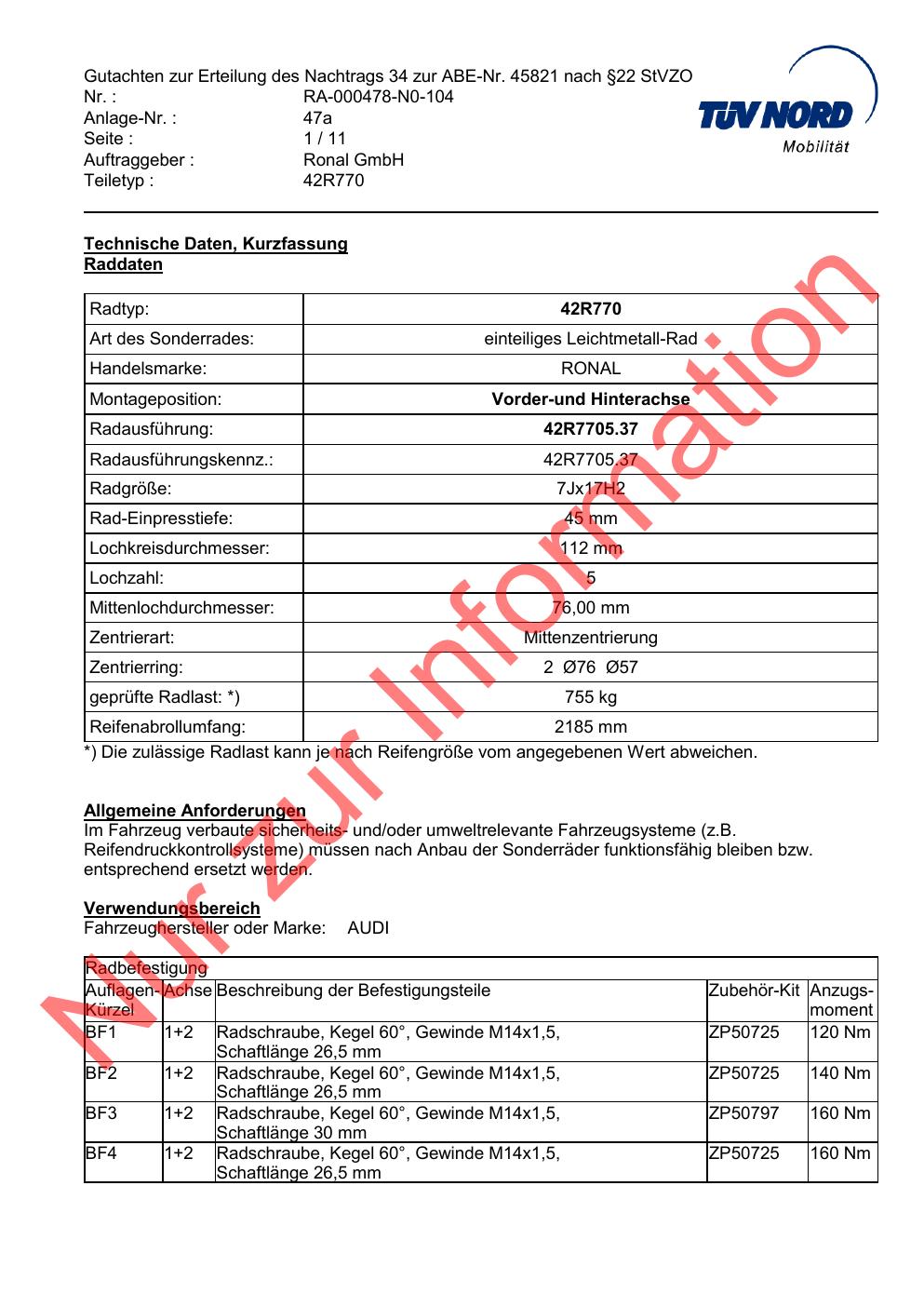 Dieses abe der Marke Ronal stammt vom jeweiligen Hersteller, Importeur oder einer Prüforganisation. Felgengutachten.de beansprucht hieran keine eigenen Urheber-, Nutzungs- oder sonstigen Schutzrechte. Soweit das Dokument urheber- oder leistungsschutzrechtlich geschützt ist, verbleiben die Rechte beim jeweiligen Rechteinhaber. Die Bereitstellung erfolgt ausschließlich zu Informationszwecken für Endnutzer, z. B. zur Vorlage bei Prüfstellen oder zur eigenen Fahrzeugdokumentation.