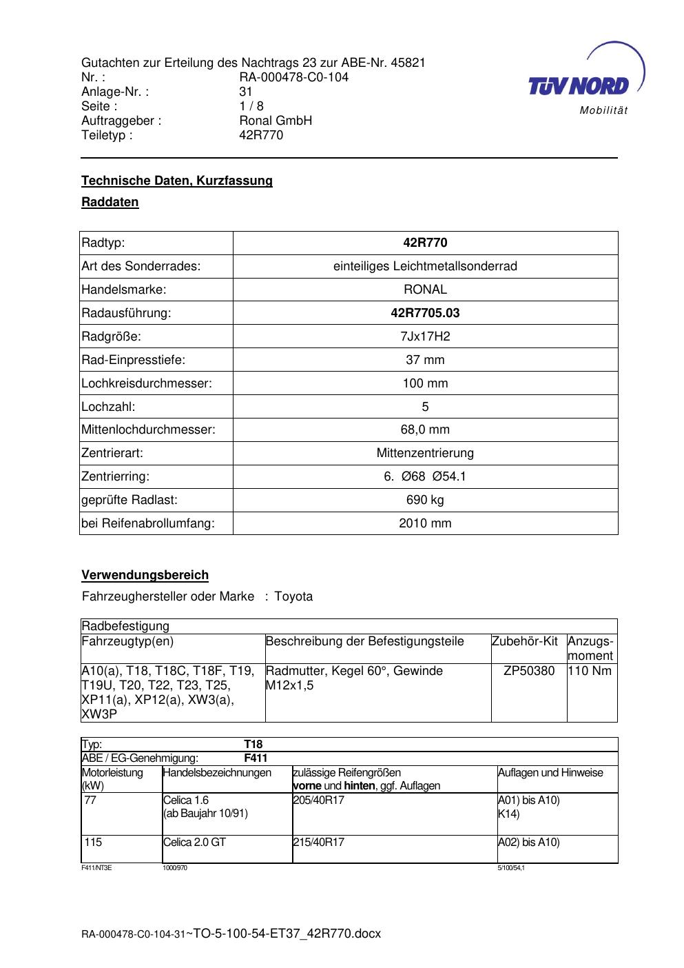 Dieses abe der Marke Ronal stammt vom jeweiligen Hersteller, Importeur oder einer Prüforganisation. Felgengutachten.de beansprucht hieran keine eigenen Urheber-, Nutzungs- oder sonstigen Schutzrechte. Soweit das Dokument urheber- oder leistungsschutzrechtlich geschützt ist, verbleiben die Rechte beim jeweiligen Rechteinhaber. Die Bereitstellung erfolgt ausschließlich zu Informationszwecken für Endnutzer, z. B. zur Vorlage bei Prüfstellen oder zur eigenen Fahrzeugdokumentation.