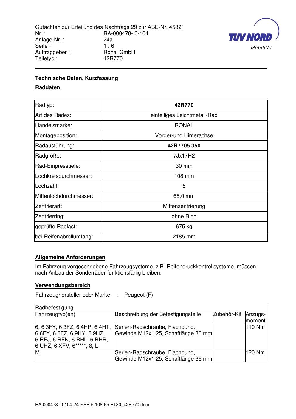 Dieses abe der Marke Ronal stammt vom jeweiligen Hersteller, Importeur oder einer Prüforganisation. Felgengutachten.de beansprucht hieran keine eigenen Urheber-, Nutzungs- oder sonstigen Schutzrechte. Soweit das Dokument urheber- oder leistungsschutzrechtlich geschützt ist, verbleiben die Rechte beim jeweiligen Rechteinhaber. Die Bereitstellung erfolgt ausschließlich zu Informationszwecken für Endnutzer, z. B. zur Vorlage bei Prüfstellen oder zur eigenen Fahrzeugdokumentation.
