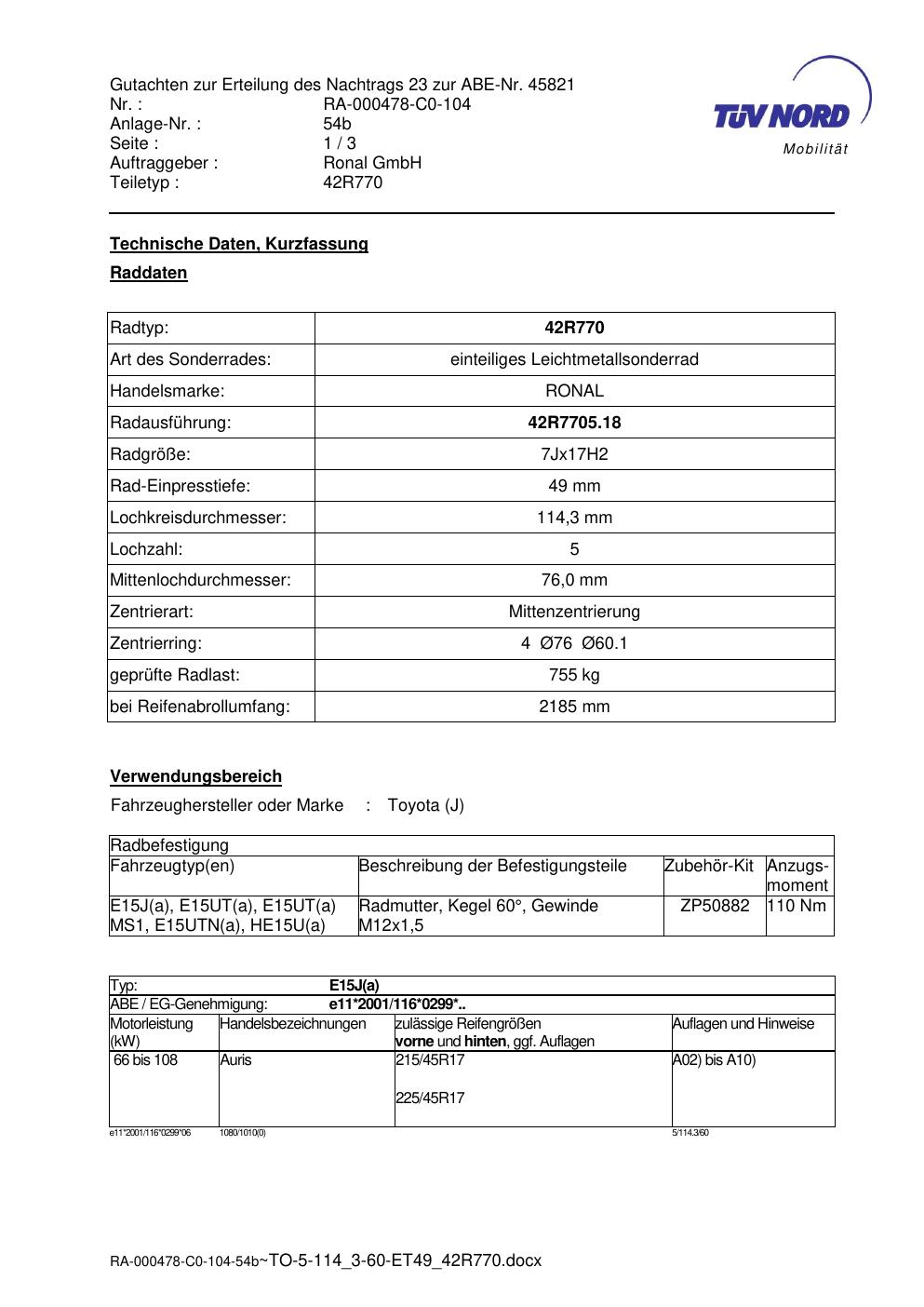 Dieses abe gehört zur Felge Ronal 42R770 in 7Jx17 ET0 mit KBA 45821. Die Seite ist dafür gedacht, dass du schnell prüfen kannst, ob KBA, Design und Größe zu deiner Felge passen und danach direkt das richtige PDF lädst.
