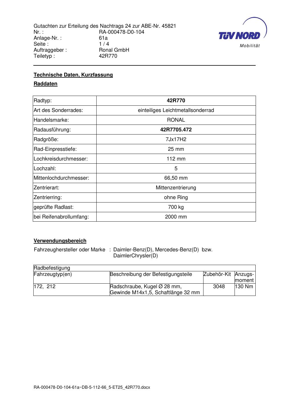 Dieses abe gehört zur Felge Ronal 42R770 in 7Jx17 ET0 mit KBA 45821. Die Seite ist dafür gedacht, dass du schnell prüfen kannst, ob KBA, Design und Größe zu deiner Felge passen und danach direkt das richtige PDF lädst.
