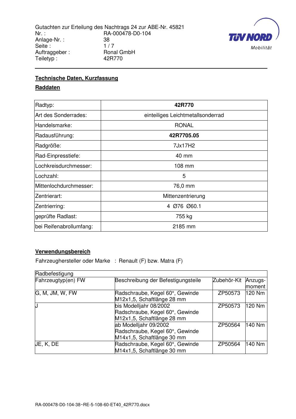Dieses Gutachten (abe) bezieht sich auf die Alufelge Ronal 42R770 in der Ausführung 7Jx17 ET 0, Mittenloch 0 mm (KBA 45821). Im PDF findest du typischerweise zulässige Reifengrößen, Auflagen/Anbauhinweise und – je nach Dokument – Hinweise zur Eintragung.