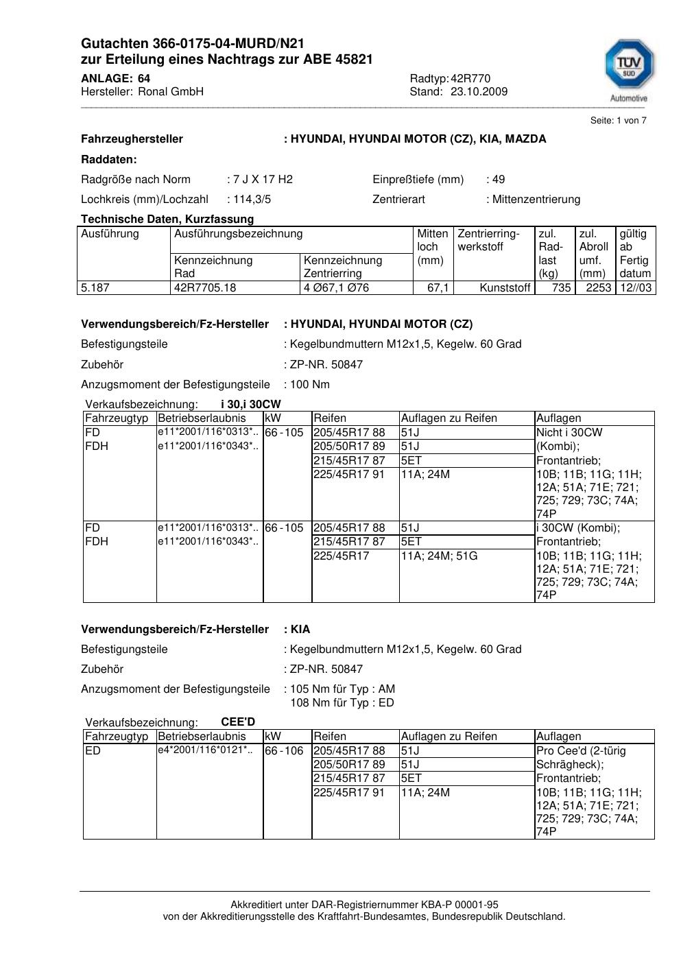 Dieses Gutachten (abe) bezieht sich auf die Alufelge Ronal 42R770 in der Ausführung 7Jx17 ET 0, Mittenloch 0 mm (KBA 45821). Im PDF findest du typischerweise zulässige Reifengrößen, Auflagen/Anbauhinweise und – je nach Dokument – Hinweise zur Eintragung.