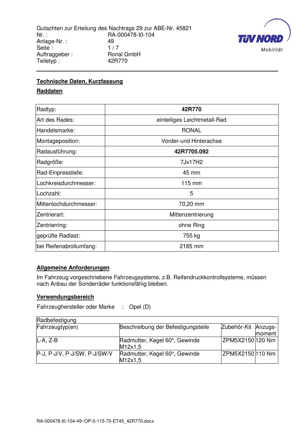 Dieses Gutachten (abe) bezieht sich auf die Alufelge Ronal 42R770 in der Ausführung 7Jx17 ET 0, Mittenloch 0 mm (KBA 45821). Im PDF findest du typischerweise zulässige Reifengrößen, Auflagen/Anbauhinweise und – je nach Dokument – Hinweise zur Eintragung.