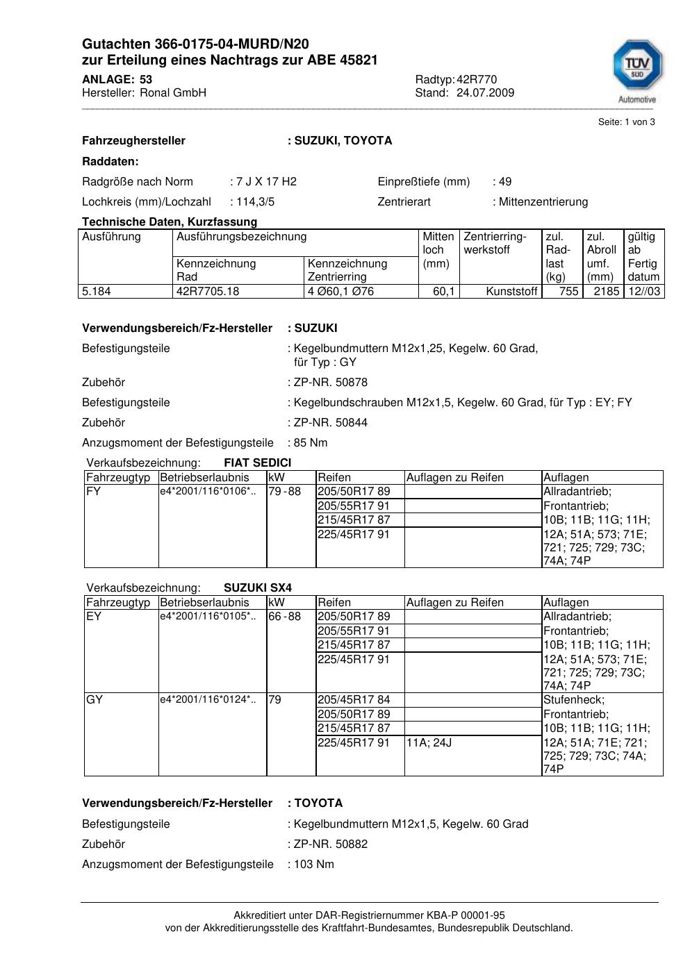 Dieses Gutachten (abe) bezieht sich auf die Alufelge Ronal 42R770 in der Ausführung 7Jx17 ET 0, Mittenloch 0 mm (KBA 45821). Im PDF findest du typischerweise zulässige Reifengrößen, Auflagen/Anbauhinweise und – je nach Dokument – Hinweise zur Eintragung.