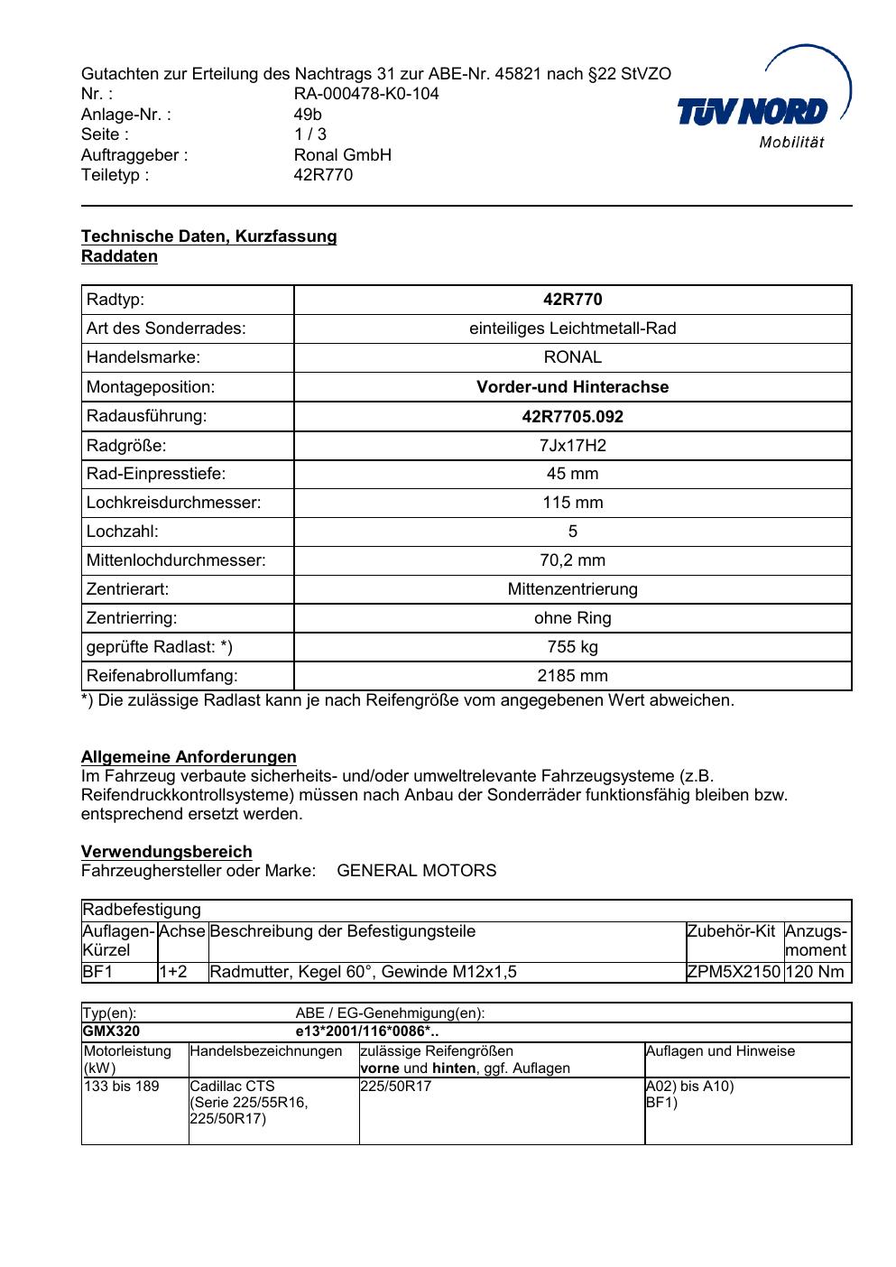 Dieses Gutachten (abe) bezieht sich auf die Alufelge Ronal 42R770 in der Ausführung 7Jx17 ET 0, Mittenloch 0 mm (KBA 45821). Im PDF findest du typischerweise zulässige Reifengrößen, Auflagen/Anbauhinweise und – je nach Dokument – Hinweise zur Eintragung.