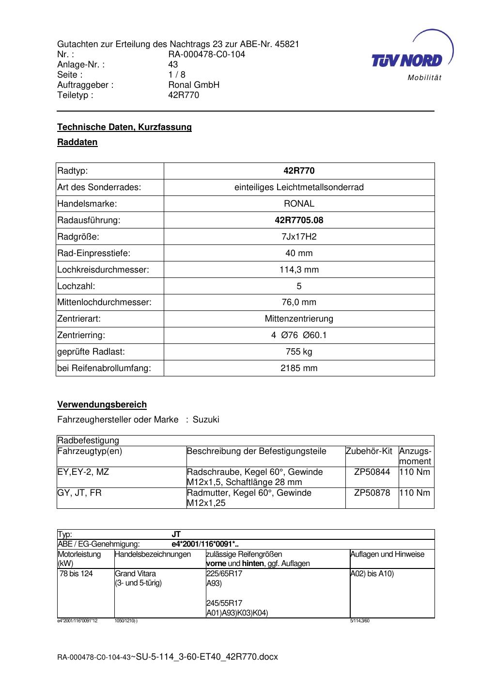 Dieses abe der Marke Ronal stammt vom jeweiligen Hersteller, Importeur oder einer Prüforganisation. Felgengutachten.de beansprucht hieran keine eigenen Urheber-, Nutzungs- oder sonstigen Schutzrechte. Soweit das Dokument urheber- oder leistungsschutzrechtlich geschützt ist, verbleiben die Rechte beim jeweiligen Rechteinhaber. Die Bereitstellung erfolgt ausschließlich zu Informationszwecken für Endnutzer, z. B. zur Vorlage bei Prüfstellen oder zur eigenen Fahrzeugdokumentation.