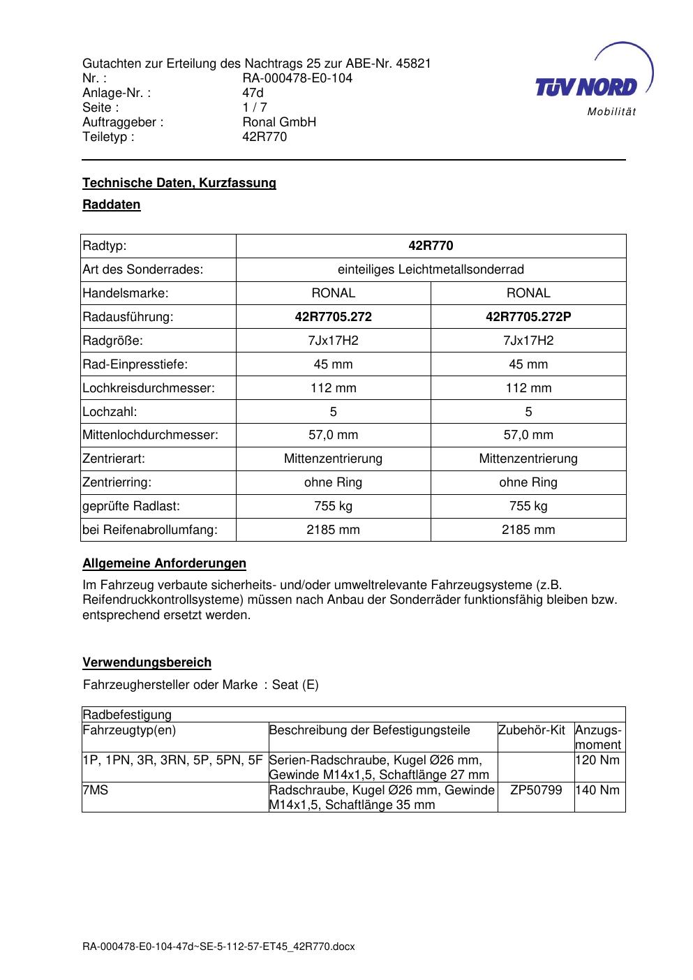 Dieses abe gehört zur Felge Ronal 42R770 in 7Jx17 ET0 mit KBA 45821. Die Seite ist dafür gedacht, dass du schnell prüfen kannst, ob KBA, Design und Größe zu deiner Felge passen und danach direkt das richtige PDF lädst.