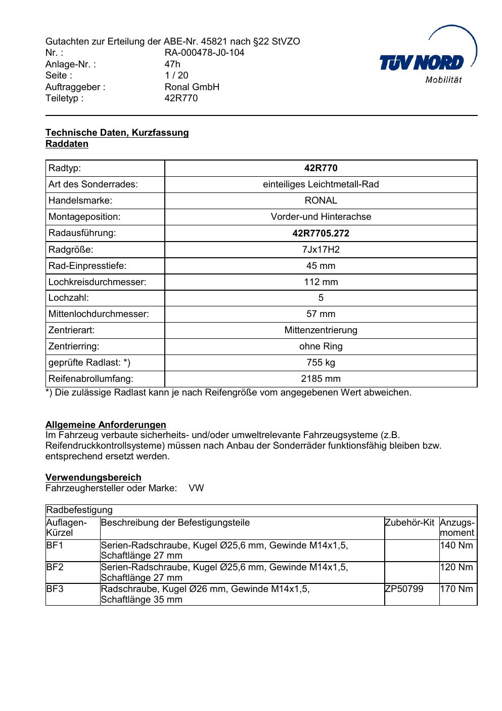 Dieses Gutachten (abe) bezieht sich auf die Alufelge Ronal 42R770 in der Ausführung 7Jx17 ET 0, Mittenloch 0 mm (KBA 45821). Im PDF findest du typischerweise zulässige Reifengrößen, Auflagen/Anbauhinweise und – je nach Dokument – Hinweise zur Eintragung.
