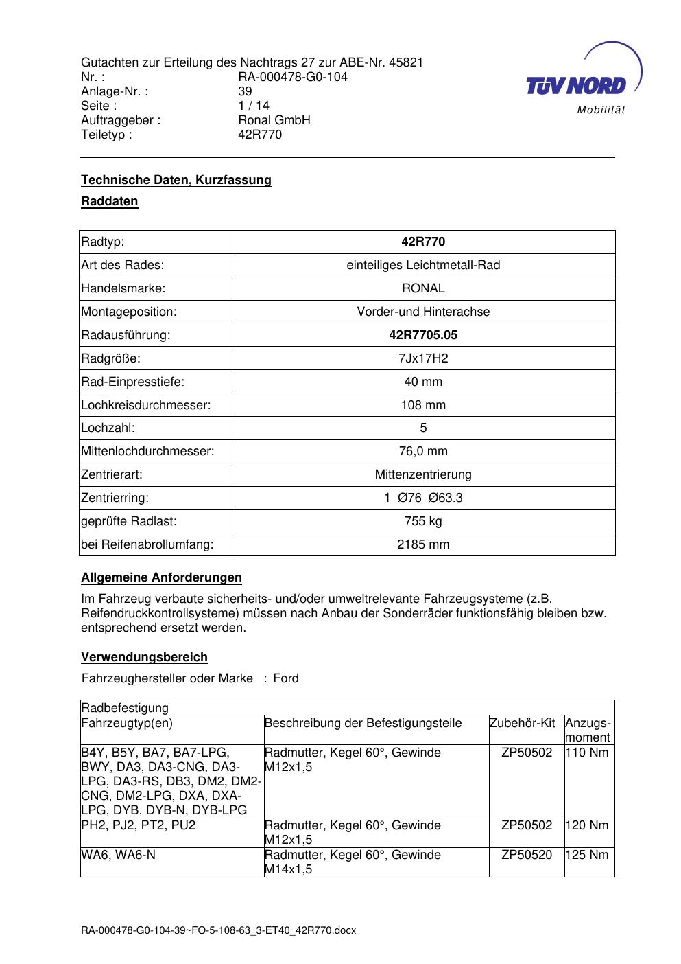 Dieses Gutachten (abe) bezieht sich auf die Alufelge Ronal 42R770 in der Ausführung 7Jx17 ET 0, Mittenloch 0 mm (KBA 45821). Im PDF findest du typischerweise zulässige Reifengrößen, Auflagen/Anbauhinweise und – je nach Dokument – Hinweise zur Eintragung.