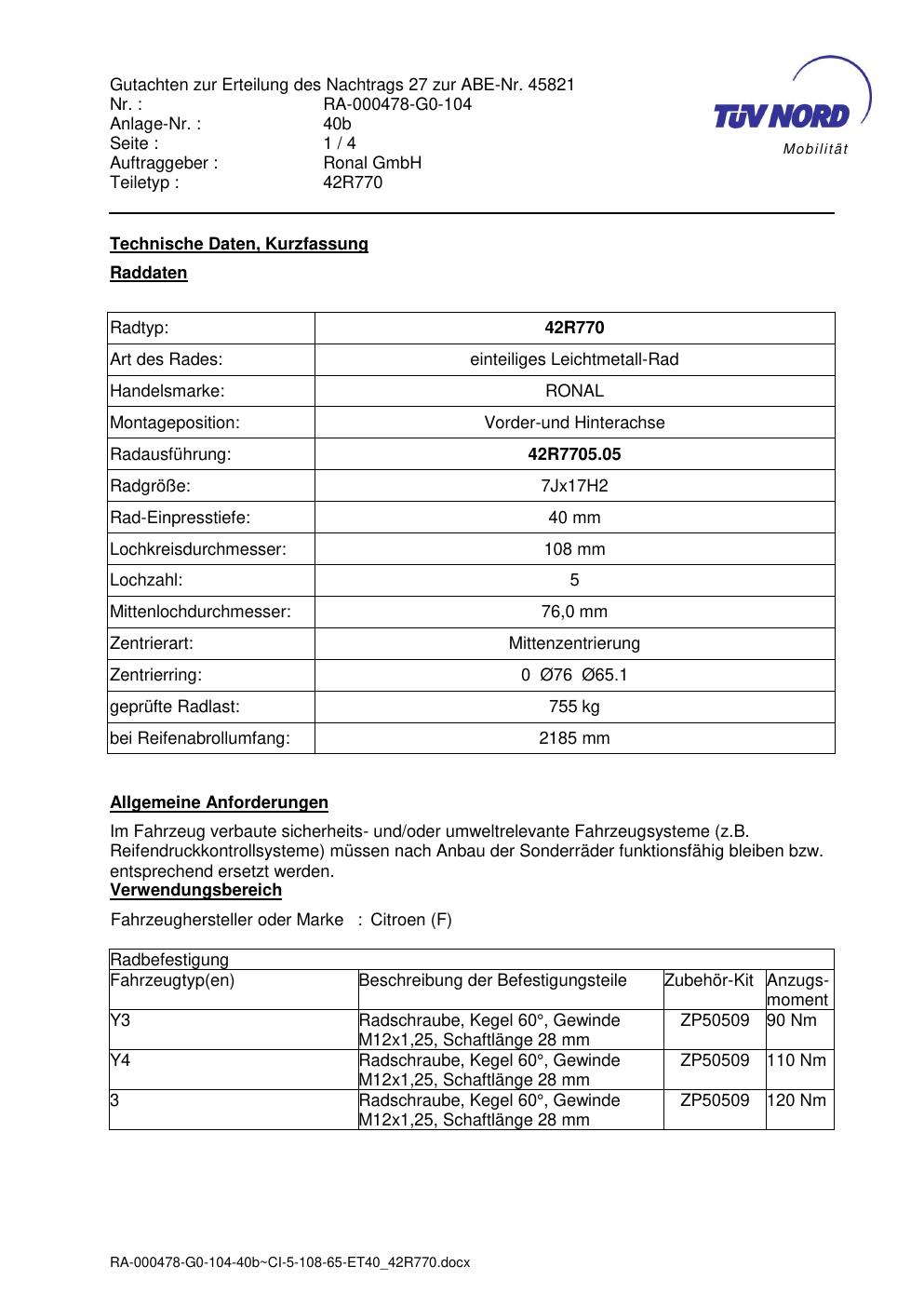 Dieses Gutachten (abe) bezieht sich auf die Alufelge Ronal 42R770 in der Ausführung 7Jx17 ET 0, Mittenloch 0 mm (KBA 45821). Im PDF findest du typischerweise zulässige Reifengrößen, Auflagen/Anbauhinweise und – je nach Dokument – Hinweise zur Eintragung.