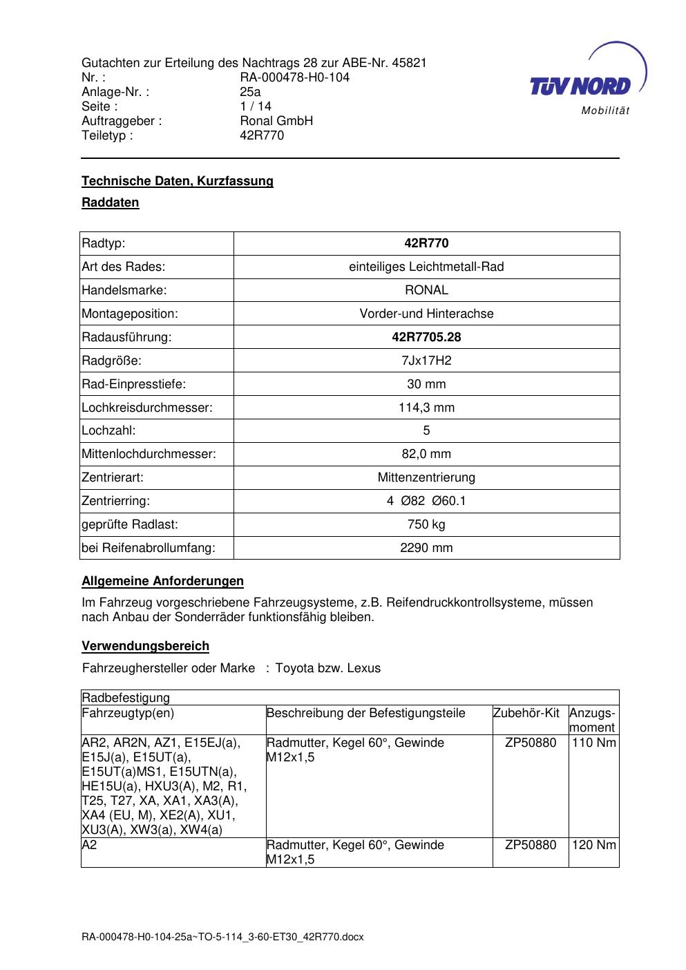 Dieses Gutachten (abe) bezieht sich auf die Alufelge Ronal 42R770 in der Ausführung 7Jx17 ET 0, Mittenloch 0 mm (KBA 45821). Im PDF findest du typischerweise zulässige Reifengrößen, Auflagen/Anbauhinweise und – je nach Dokument – Hinweise zur Eintragung.
