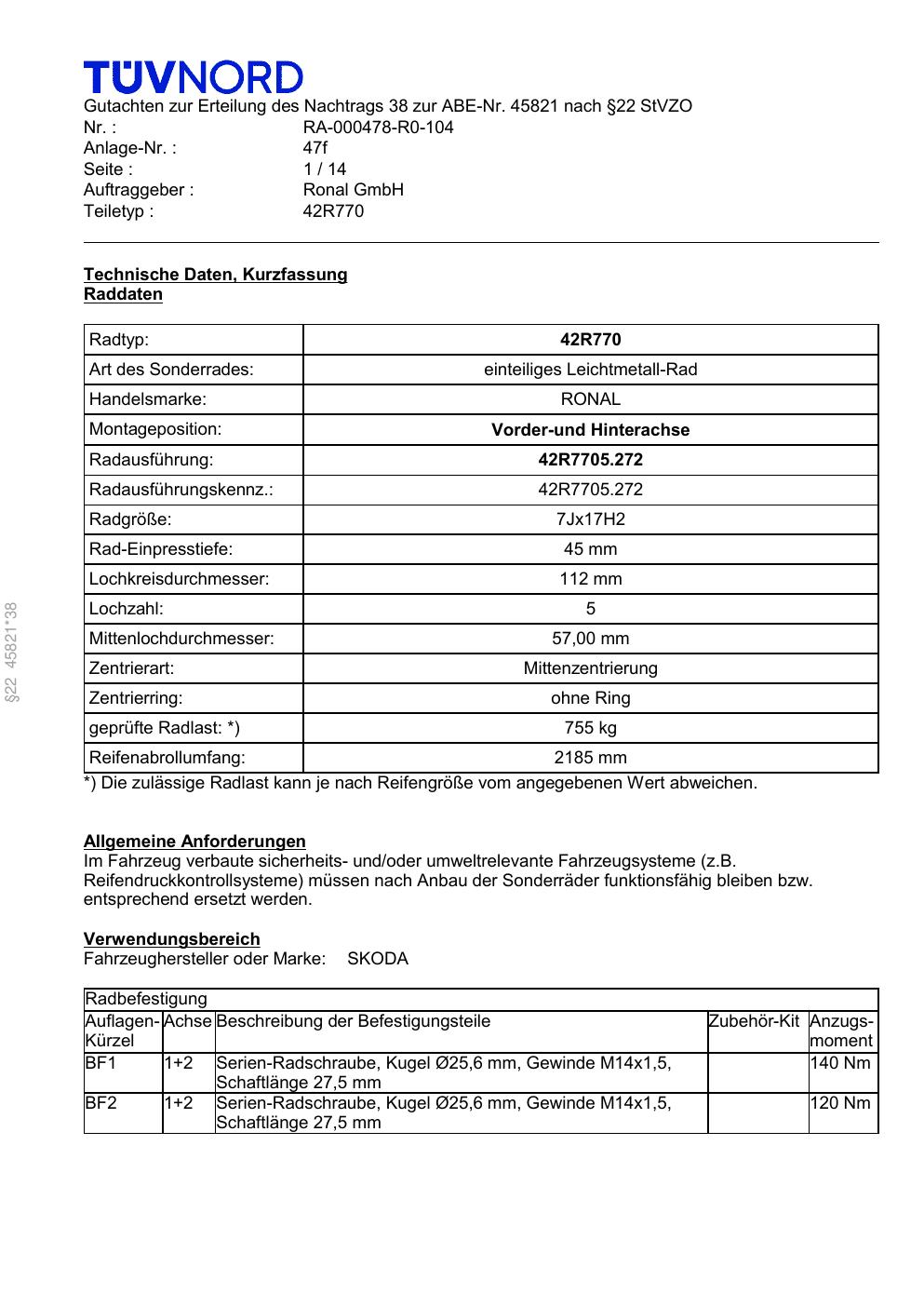 Dieses Gutachten (abe) bezieht sich auf die Alufelge Ronal 42R770 in der Ausführung 7Jx17 ET 0, Mittenloch 0 mm (KBA 45821). Im PDF findest du typischerweise zulässige Reifengrößen, Auflagen/Anbauhinweise und – je nach Dokument – Hinweise zur Eintragung.