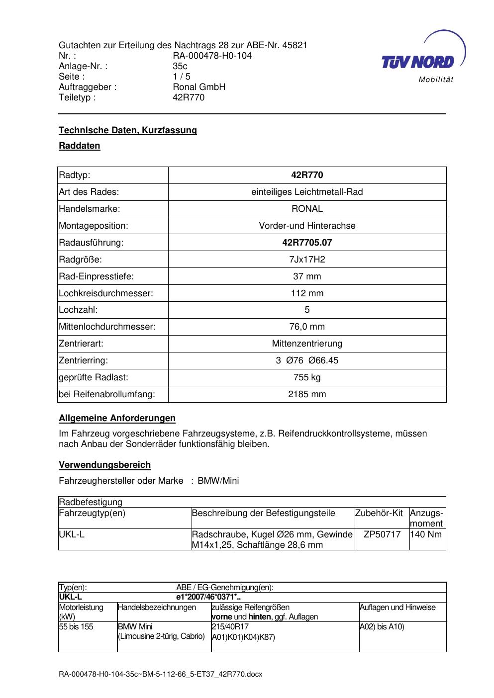 Dieses abe gehört zur Felge Ronal 42R770 in 7Jx17 ET0 mit KBA 45821. Die Seite ist dafür gedacht, dass du schnell prüfen kannst, ob KBA, Design und Größe zu deiner Felge passen und danach direkt das richtige PDF lädst.