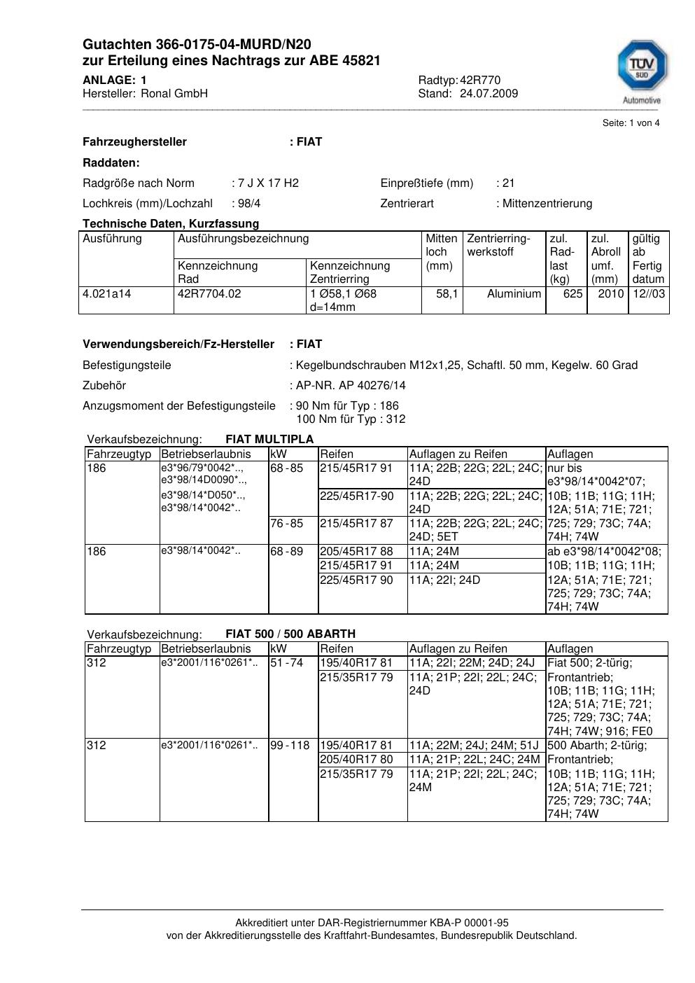 Dieses Gutachten (abe) bezieht sich auf die Alufelge Ronal 42R770 in der Ausführung 7Jx17 ET 0, Mittenloch 0 mm (KBA 45821). Im PDF findest du typischerweise zulässige Reifengrößen, Auflagen/Anbauhinweise und – je nach Dokument – Hinweise zur Eintragung.