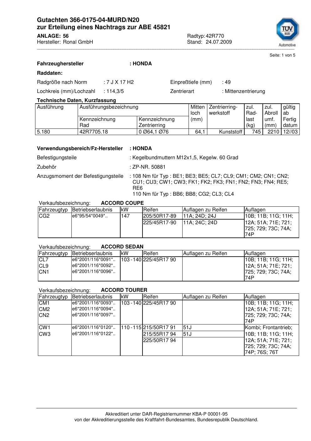 Dieses Gutachten (abe) bezieht sich auf die Alufelge Ronal 42R770 in der Ausführung 7Jx17 ET 0, Mittenloch 0 mm (KBA 45821). Im PDF findest du typischerweise zulässige Reifengrößen, Auflagen/Anbauhinweise und – je nach Dokument – Hinweise zur Eintragung.