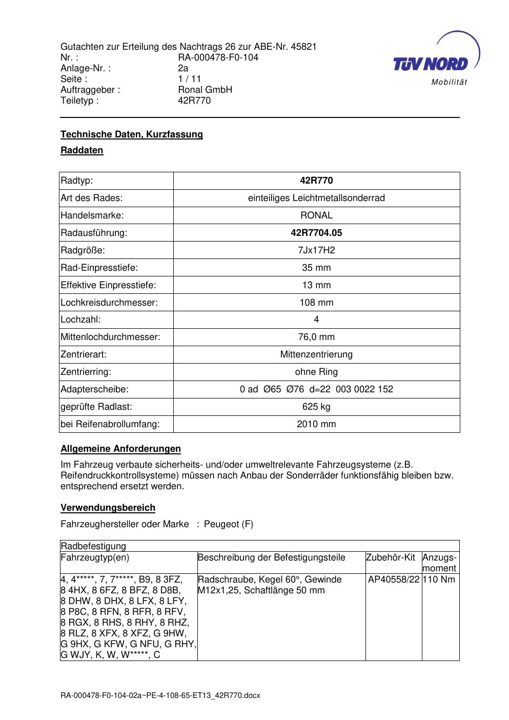 Dieses abe der Marke Ronal stammt vom jeweiligen Hersteller, Importeur oder einer Prüforganisation. Felgengutachten.de beansprucht hieran keine eigenen Urheber-, Nutzungs- oder sonstigen Schutzrechte. Soweit das Dokument urheber- oder leistungsschutzrechtlich geschützt ist, verbleiben die Rechte beim jeweiligen Rechteinhaber. Die Bereitstellung erfolgt ausschließlich zu Informationszwecken für Endnutzer, z. B. zur Vorlage bei Prüfstellen oder zur eigenen Fahrzeugdokumentation.