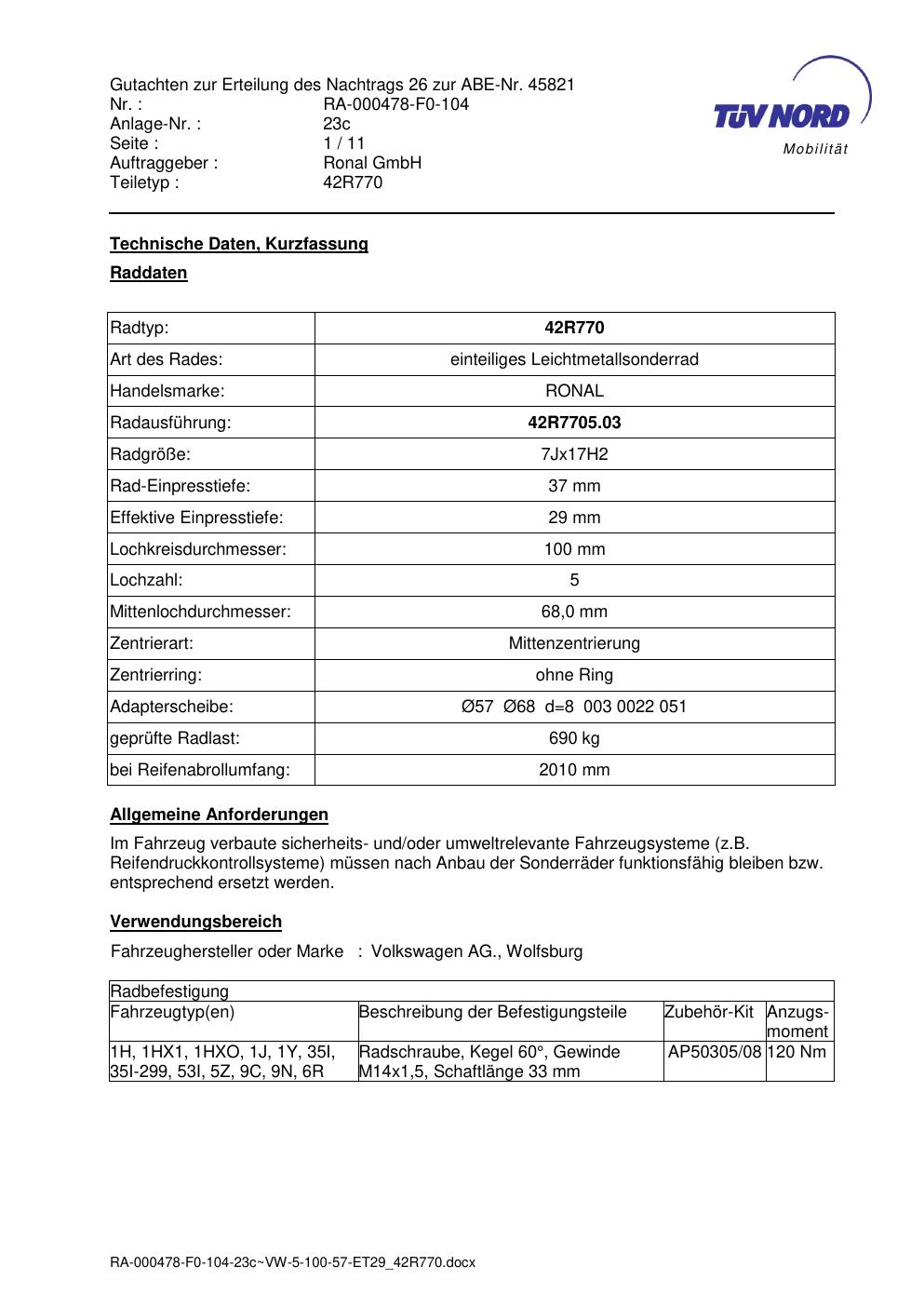 Dieses Gutachten (abe) bezieht sich auf die Alufelge Ronal 42R770 in der Ausführung 7Jx17 ET 0, Mittenloch 0 mm (KBA 45821). Im PDF findest du typischerweise zulässige Reifengrößen, Auflagen/Anbauhinweise und – je nach Dokument – Hinweise zur Eintragung.