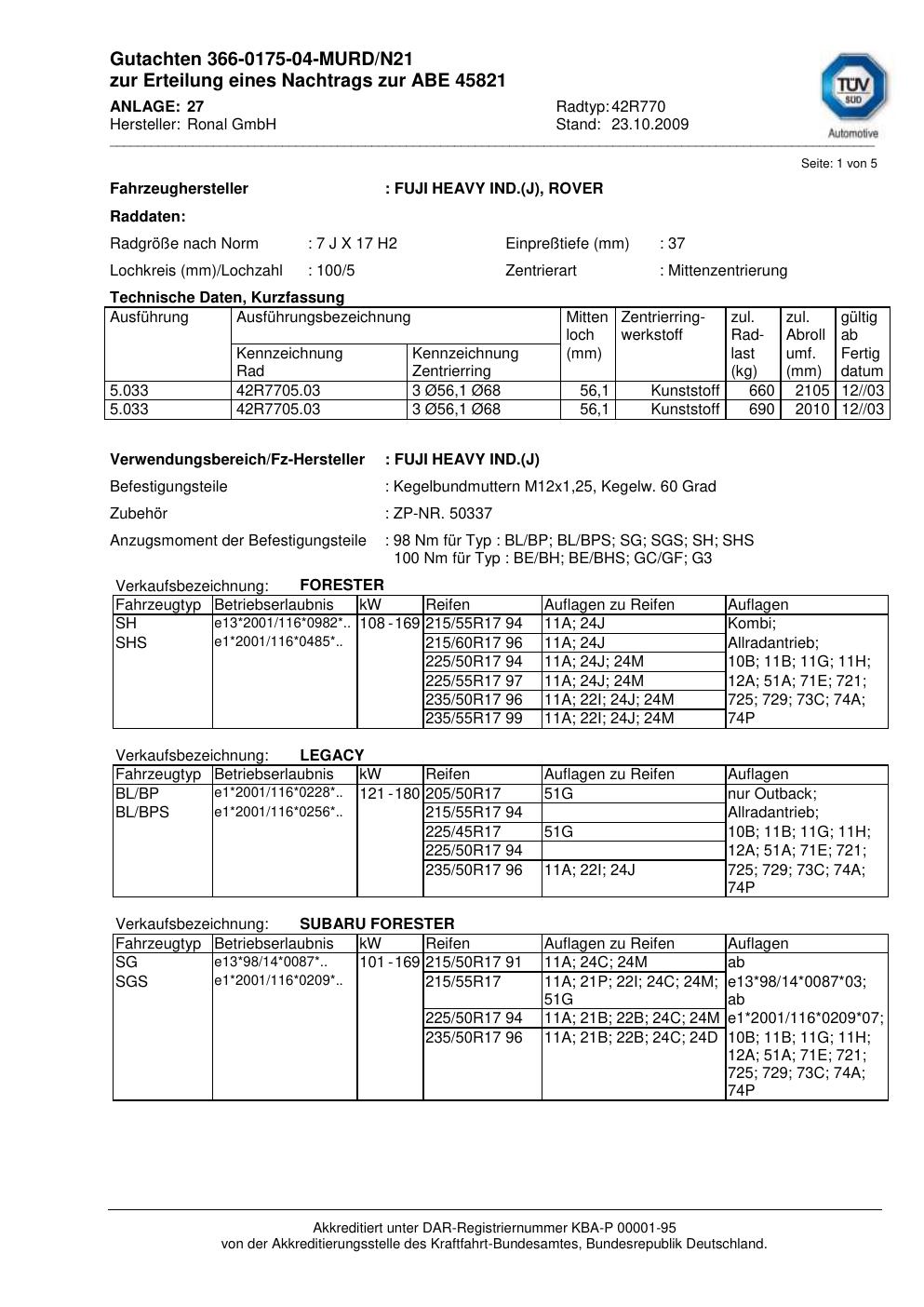 Dieses Gutachten (abe) bezieht sich auf die Alufelge Ronal 42R770 in der Ausführung 7Jx17 ET 0, Mittenloch 0 mm (KBA 45821). Im PDF findest du typischerweise zulässige Reifengrößen, Auflagen/Anbauhinweise und – je nach Dokument – Hinweise zur Eintragung.