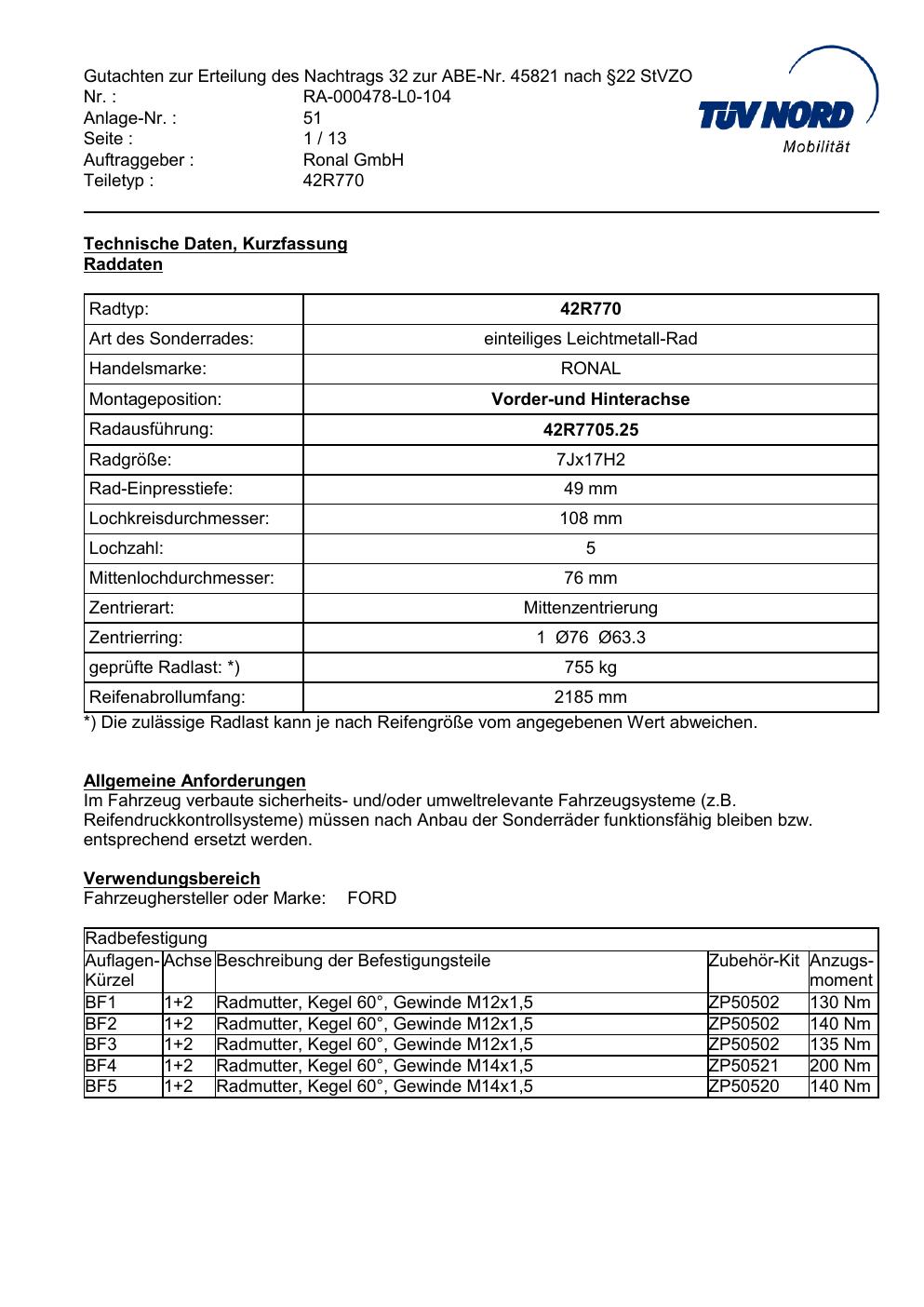 Dieses abe der Marke Ronal stammt vom jeweiligen Hersteller, Importeur oder einer Prüforganisation. Felgengutachten.de beansprucht hieran keine eigenen Urheber-, Nutzungs- oder sonstigen Schutzrechte. Soweit das Dokument urheber- oder leistungsschutzrechtlich geschützt ist, verbleiben die Rechte beim jeweiligen Rechteinhaber. Die Bereitstellung erfolgt ausschließlich zu Informationszwecken für Endnutzer, z. B. zur Vorlage bei Prüfstellen oder zur eigenen Fahrzeugdokumentation.