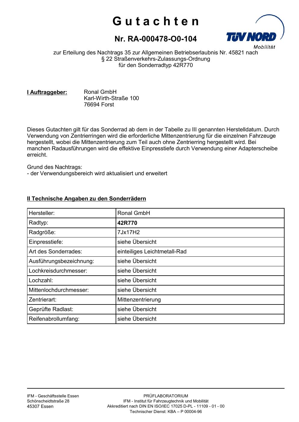 Dieses abe gehört zur Felge Ronal 42R770 in 7Jx17 ET0 mit KBA 45821. Die Seite ist dafür gedacht, dass du schnell prüfen kannst, ob KBA, Design und Größe zu deiner Felge passen und danach direkt das richtige PDF lädst.