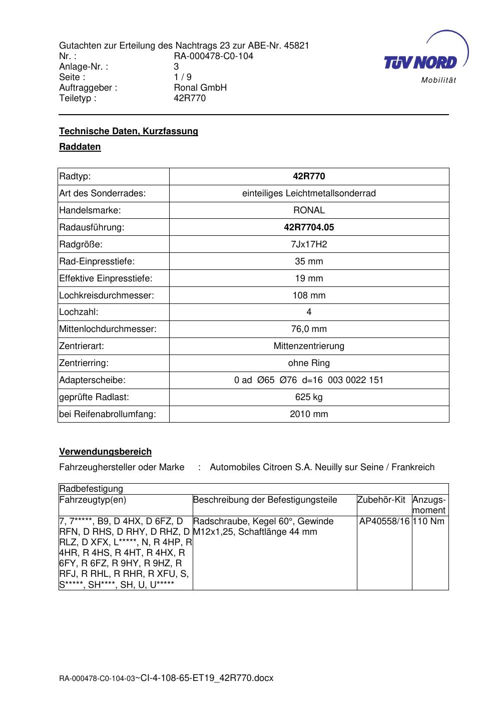 Dieses abe gehört zur Felge Ronal 42R770 in 7Jx17 ET0 mit KBA 45821. Die Seite ist dafür gedacht, dass du schnell prüfen kannst, ob KBA, Design und Größe zu deiner Felge passen und danach direkt das richtige PDF lädst.