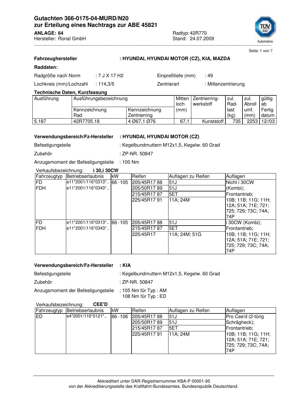 Dieses Gutachten (abe) bezieht sich auf die Alufelge Ronal 42R770 in der Ausführung 7Jx17 ET 0, Mittenloch 0 mm (KBA 45821). Im PDF findest du typischerweise zulässige Reifengrößen, Auflagen/Anbauhinweise und – je nach Dokument – Hinweise zur Eintragung.