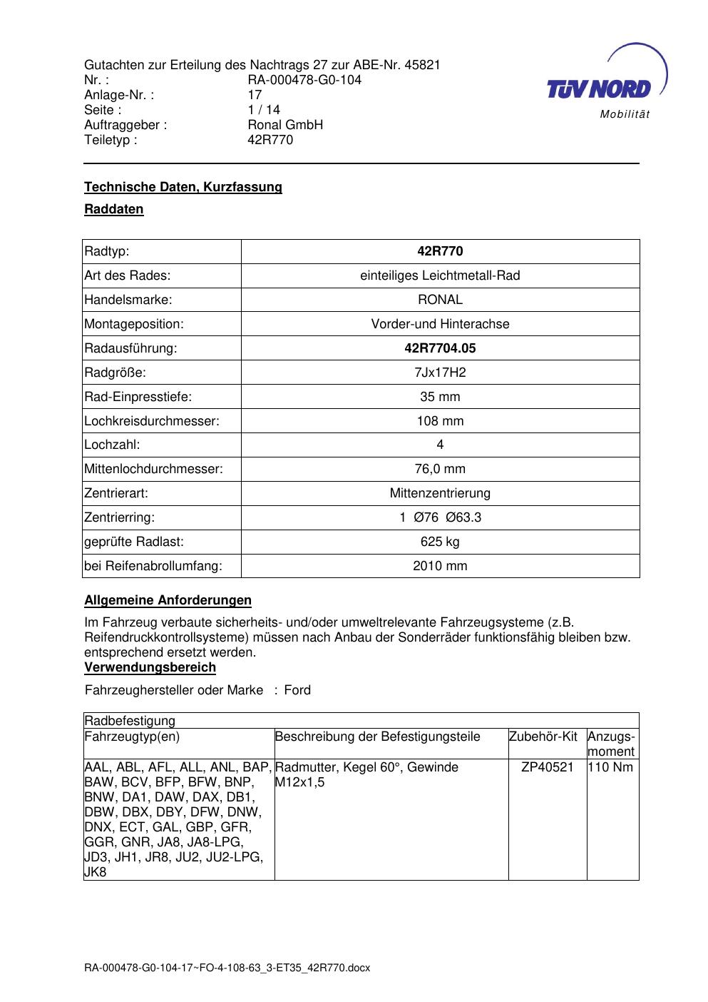 Dieses abe gehört zur Felge Ronal 42R770 in 7Jx17 ET0 mit KBA 45821. Die Seite ist dafür gedacht, dass du schnell prüfen kannst, ob KBA, Design und Größe zu deiner Felge passen und danach direkt das richtige PDF lädst.