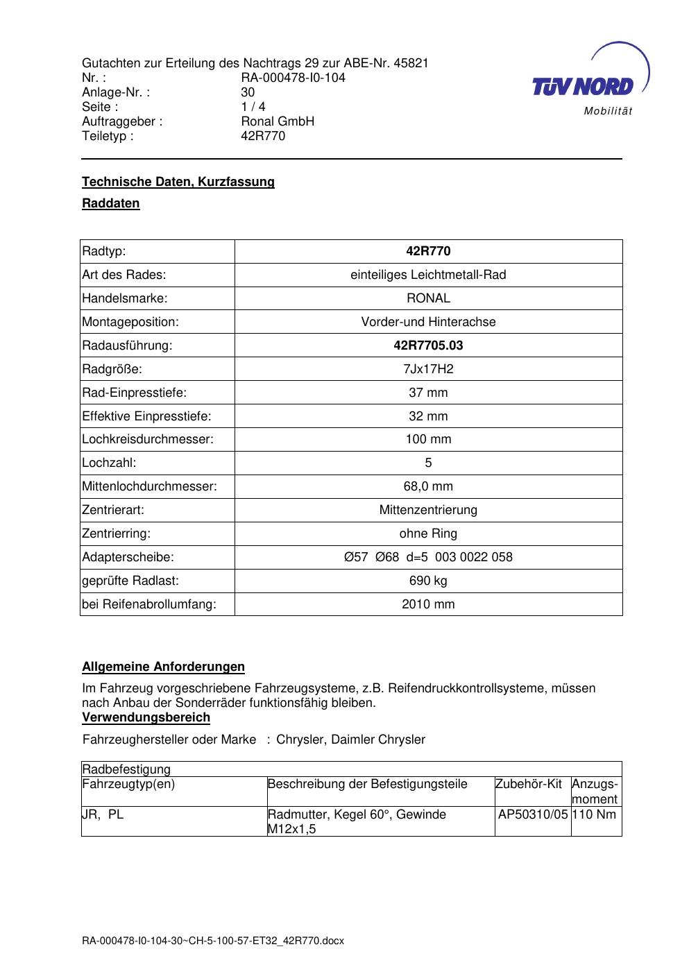 Dieses Gutachten (abe) bezieht sich auf die Alufelge Ronal 42R770 in der Ausführung 7Jx17 ET 0, Mittenloch 0 mm (KBA 45821). Im PDF findest du typischerweise zulässige Reifengrößen, Auflagen/Anbauhinweise und – je nach Dokument – Hinweise zur Eintragung.