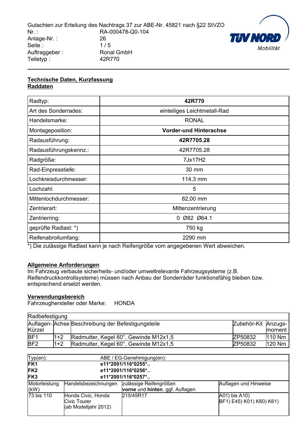 Dieses abe der Marke Ronal stammt vom jeweiligen Hersteller, Importeur oder einer Prüforganisation. Felgengutachten.de beansprucht hieran keine eigenen Urheber-, Nutzungs- oder sonstigen Schutzrechte. Soweit das Dokument urheber- oder leistungsschutzrechtlich geschützt ist, verbleiben die Rechte beim jeweiligen Rechteinhaber. Die Bereitstellung erfolgt ausschließlich zu Informationszwecken für Endnutzer, z. B. zur Vorlage bei Prüfstellen oder zur eigenen Fahrzeugdokumentation.