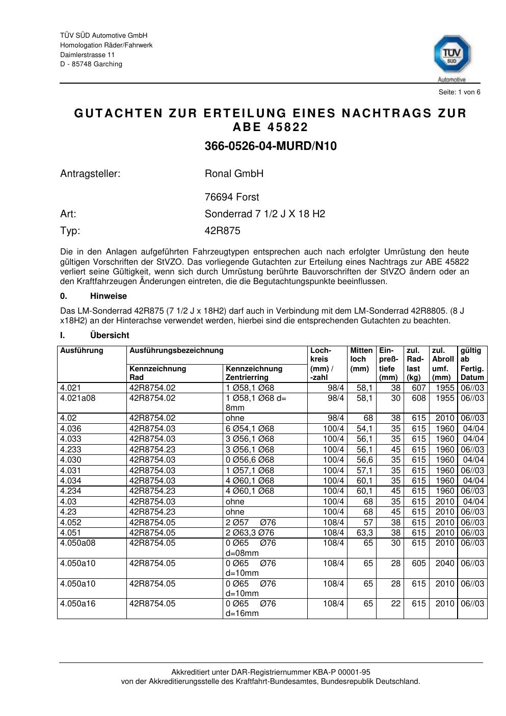 Dieses Gutachten (abe) bezieht sich auf die Alufelge ATS 42R875 in der Ausführung 2Jx18 ET 0, Mittenloch 0 mm (KBA 45822). Im PDF findest du typischerweise zulässige Reifengrößen, Auflagen/Anbauhinweise und – je nach Dokument – Hinweise zur Eintragung.