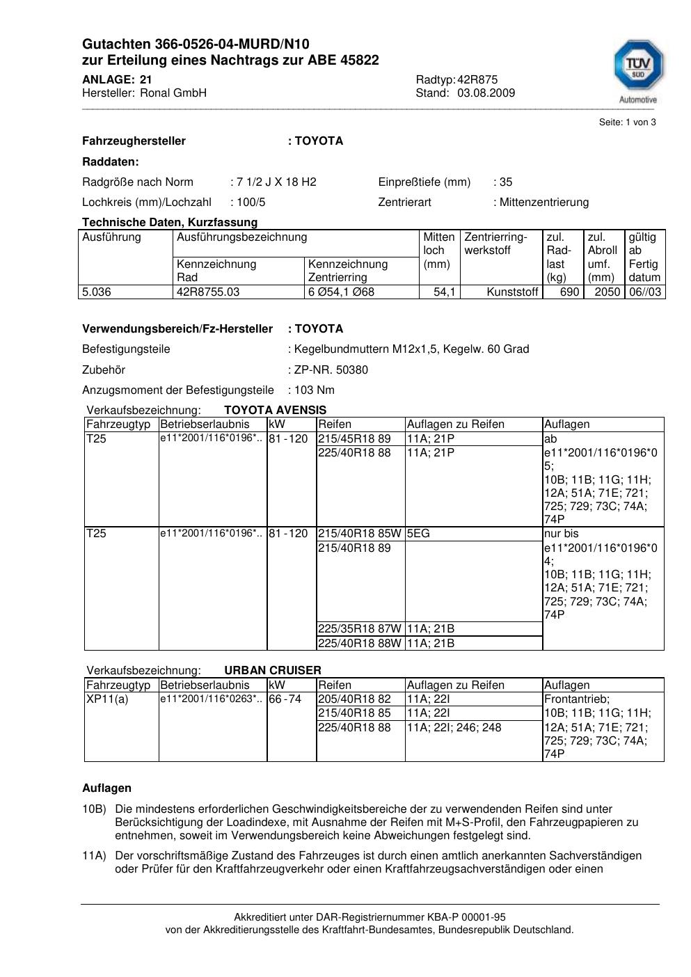 Dieses Gutachten (abe) bezieht sich auf die Alufelge Ronal 42R875 in der Ausführung 2Jx18 ET 0, Mittenloch 0 mm (KBA 45822). Im PDF findest du typischerweise zulässige Reifengrößen, Auflagen/Anbauhinweise und – je nach Dokument – Hinweise zur Eintragung.