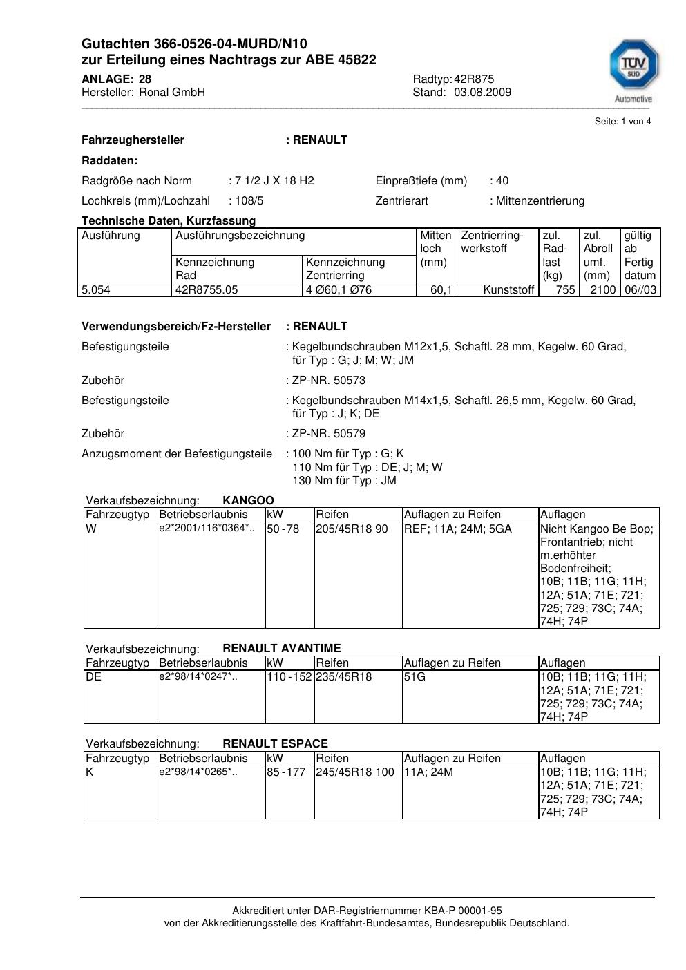 Felgengutachten / abe für Alufelgen Ronal 42R875 (2Jx18 ET 0, Mittenloch 0 mm) mit KBA 45822 (Zertifikatsnummer 45822). Hier kostenlos als PDF herunterladen. Der Download-Link ist 24 Stunden gültig und kann bis zu zwei Mal verwendet werden.