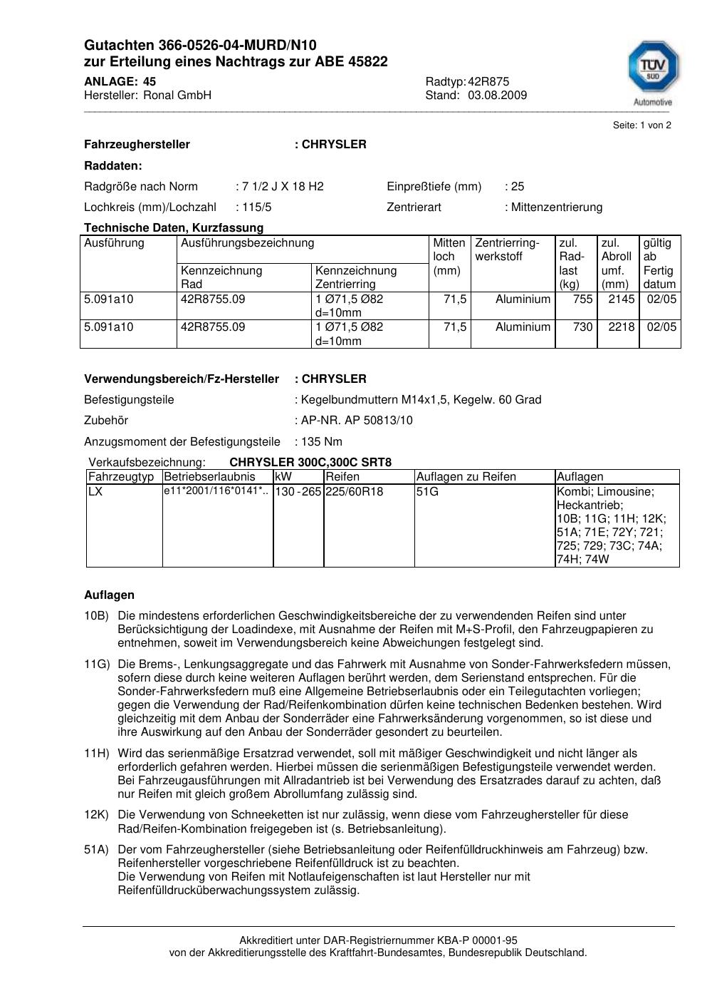 Dieses Gutachten (abe) bezieht sich auf die Alufelge Ronal 42R875 in der Ausführung 2Jx18 ET 0, Mittenloch 0 mm (KBA 45822). Im PDF findest du typischerweise zulässige Reifengrößen, Auflagen/Anbauhinweise und – je nach Dokument – Hinweise zur Eintragung.