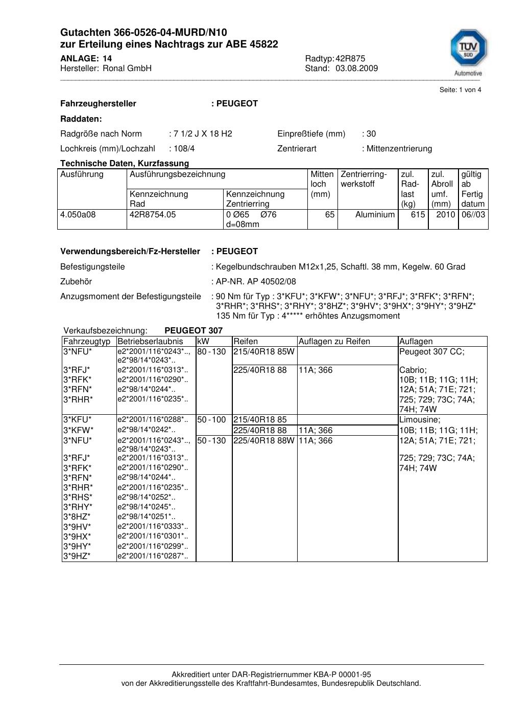 Dieses Gutachten (abe) bezieht sich auf die Alufelge Ronal 42R875 in der Ausführung 2Jx18 ET 0, Mittenloch 0 mm (KBA 45822). Im PDF findest du typischerweise zulässige Reifengrößen, Auflagen/Anbauhinweise und – je nach Dokument – Hinweise zur Eintragung.