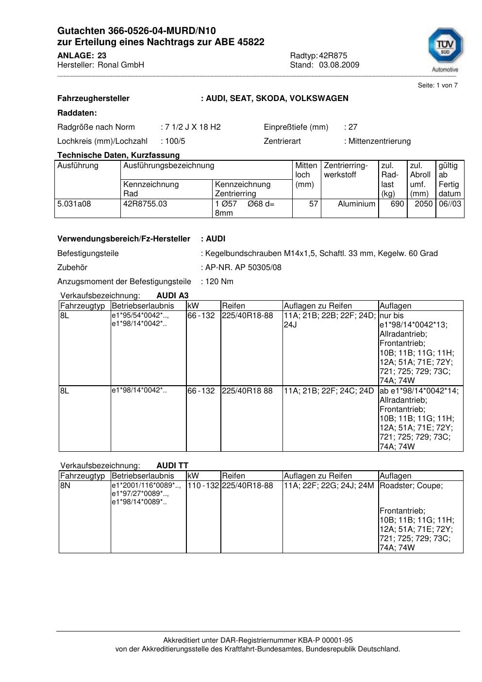 Felgengutachten / abe für Alufelgen Ronal 42R875 (2Jx18 ET 0, Mittenloch 0 mm) mit KBA 45822 (Zertifikatsnummer 45822). Hier kostenlos als PDF herunterladen. Der Download-Link ist 24 Stunden gültig und kann bis zu zwei Mal verwendet werden.