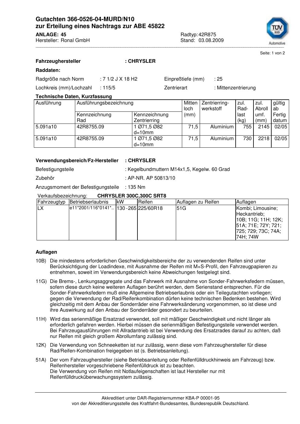 Dieses Gutachten (abe) bezieht sich auf die Alufelge Ronal 42R875 in der Ausführung 2Jx18 ET 0, Mittenloch 0 mm (KBA 45822). Im PDF findest du typischerweise zulässige Reifengrößen, Auflagen/Anbauhinweise und – je nach Dokument – Hinweise zur Eintragung.