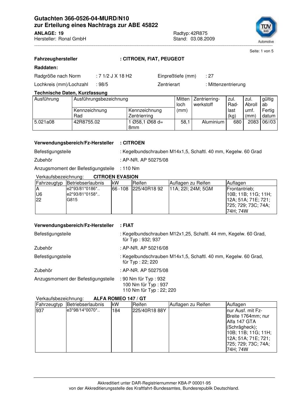 Felgengutachten / abe für Alufelgen Ronal 42R875 (2Jx18 ET 0, Mittenloch 0 mm) mit KBA 45822 (Zertifikatsnummer 45822). Hier kostenlos als PDF herunterladen. Der Download-Link ist 24 Stunden gültig und kann bis zu zwei Mal verwendet werden.