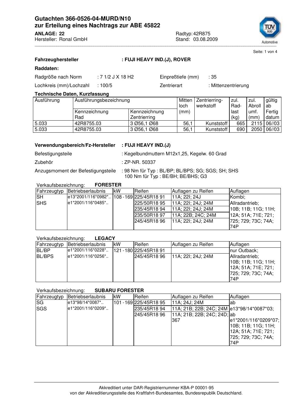 Dieses Gutachten (abe) bezieht sich auf die Alufelge Ronal 42R875 in der Ausführung 2Jx18 ET 0, Mittenloch 0 mm (KBA 45822). Im PDF findest du typischerweise zulässige Reifengrößen, Auflagen/Anbauhinweise und – je nach Dokument – Hinweise zur Eintragung.