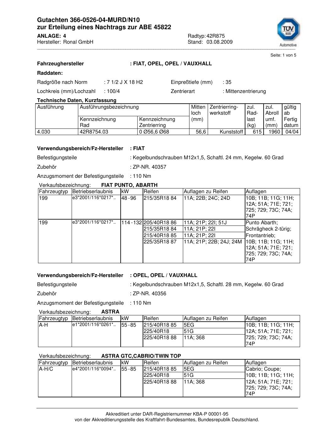Dieses Gutachten (abe) bezieht sich auf die Alufelge Ronal 42R875 in der Ausführung 2Jx18 ET 0, Mittenloch 0 mm (KBA 45822). Im PDF findest du typischerweise zulässige Reifengrößen, Auflagen/Anbauhinweise und – je nach Dokument – Hinweise zur Eintragung.