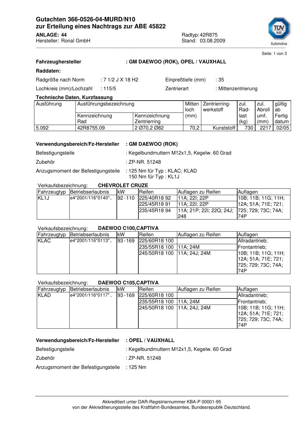 Felgengutachten / abe für Alufelgen Ronal 42R875 (2Jx18 ET 0, Mittenloch 0 mm) mit KBA 45822 (Zertifikatsnummer 45822). Hier kostenlos als PDF herunterladen. Der Download-Link ist 24 Stunden gültig und kann bis zu zwei Mal verwendet werden.
