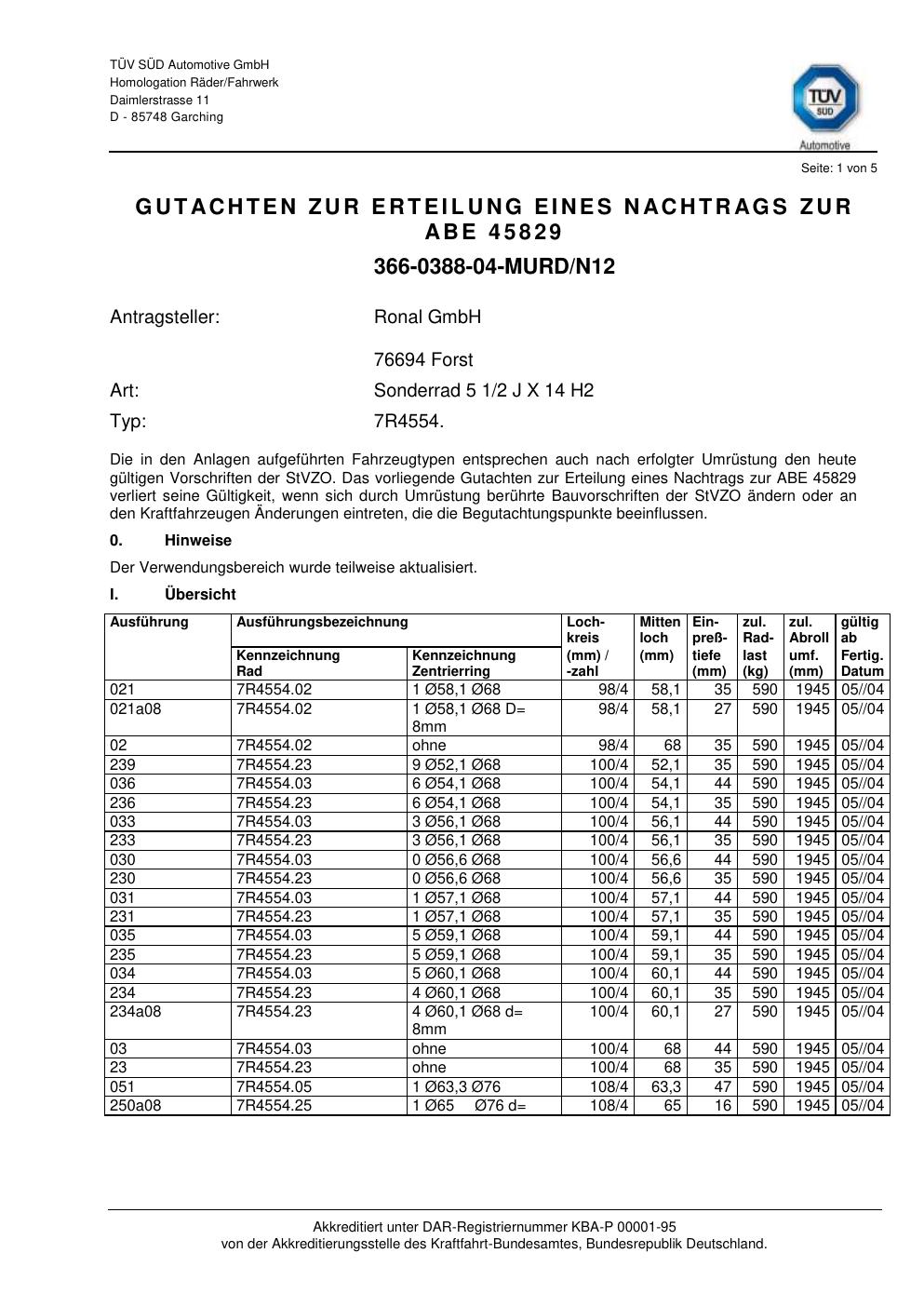 Dieses Gutachten (abe) bezieht sich auf die Alufelge ATS 7R4554 in der Ausführung 2Jx14 ET 0, Mittenloch 0 mm (KBA 45829). Im PDF findest du typischerweise zulässige Reifengrößen, Auflagen/Anbauhinweise und – je nach Dokument – Hinweise zur Eintragung.