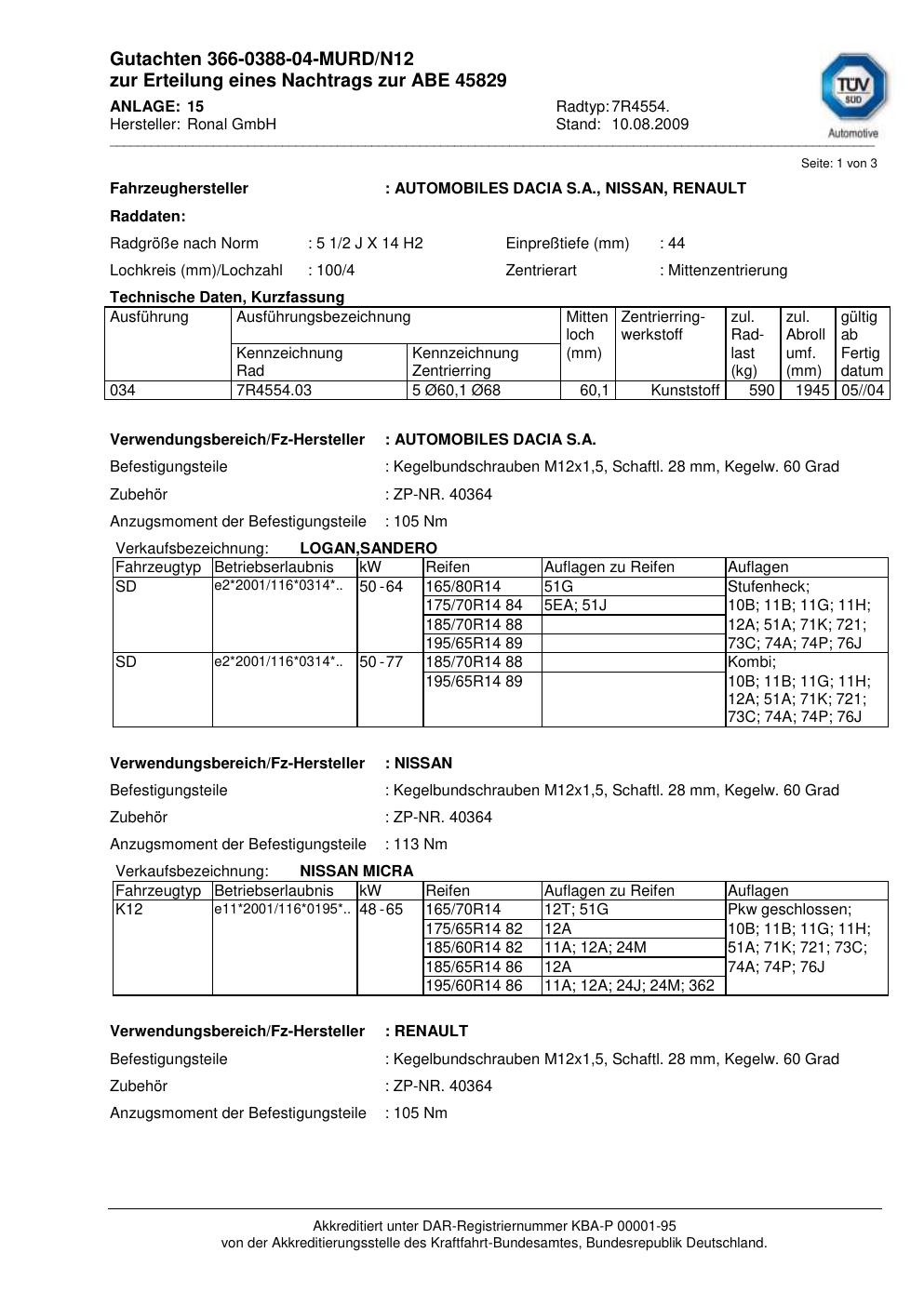 Dieses Gutachten (abe) bezieht sich auf die Alufelge Ronal 7R4554 in der Ausführung 2Jx14 ET 0, Mittenloch 0 mm (KBA 45829). Im PDF findest du typischerweise zulässige Reifengrößen, Auflagen/Anbauhinweise und – je nach Dokument – Hinweise zur Eintragung.