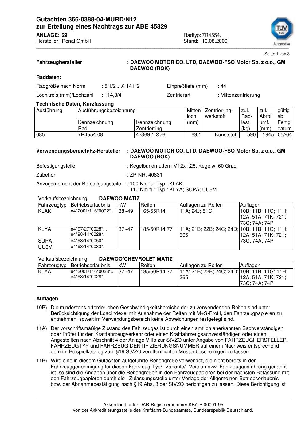 Dieses Gutachten (abe) bezieht sich auf die Alufelge Ronal 7R4554 in der Ausführung 2Jx14 ET 0, Mittenloch 0 mm (KBA 45829). Im PDF findest du typischerweise zulässige Reifengrößen, Auflagen/Anbauhinweise und – je nach Dokument – Hinweise zur Eintragung.