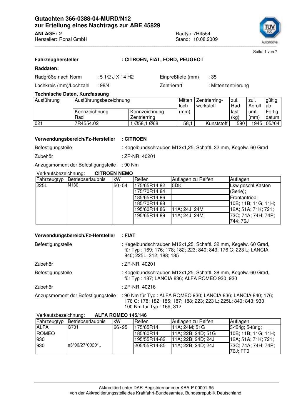Dieses Gutachten (abe) bezieht sich auf die Alufelge Ronal 7R4554 in der Ausführung 2Jx14 ET 0, Mittenloch 0 mm (KBA 45829). Im PDF findest du typischerweise zulässige Reifengrößen, Auflagen/Anbauhinweise und – je nach Dokument – Hinweise zur Eintragung.